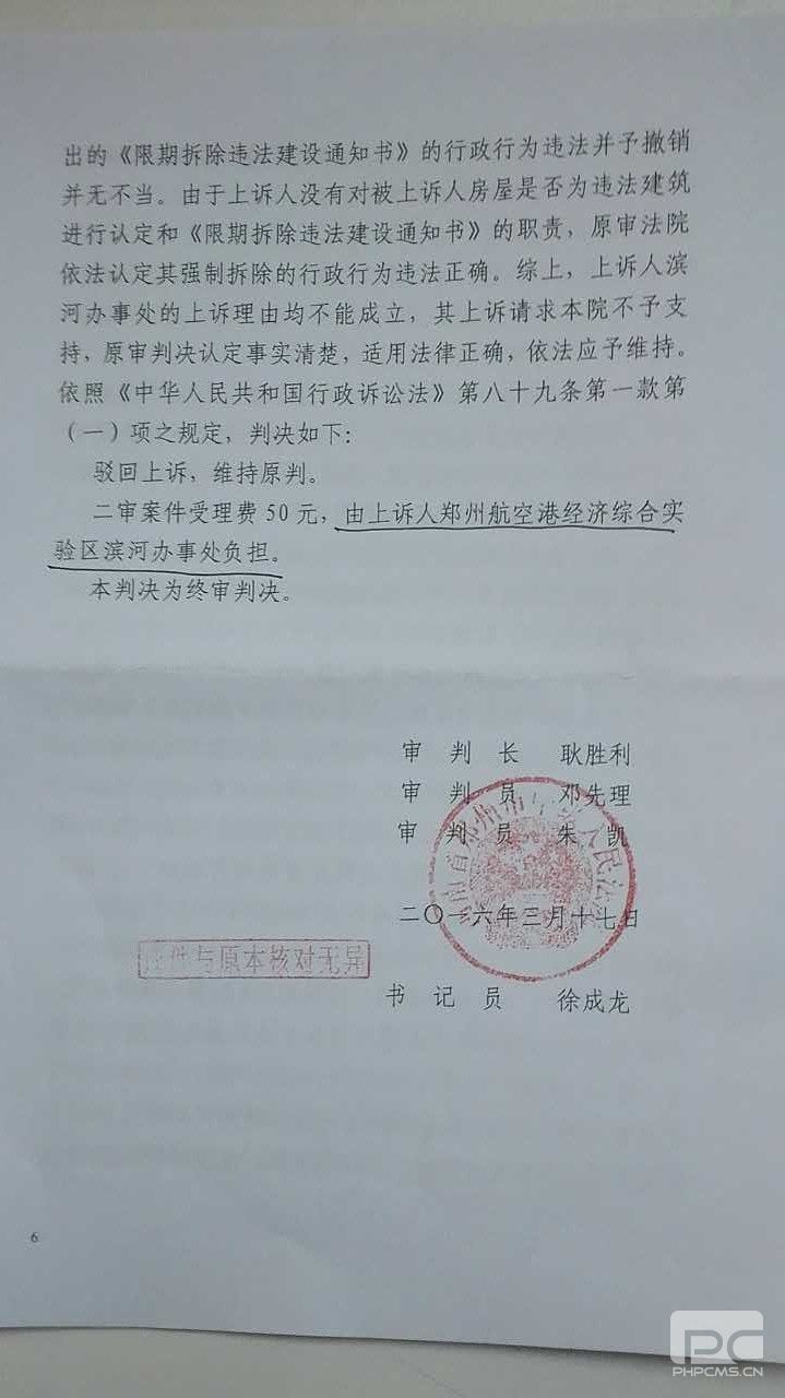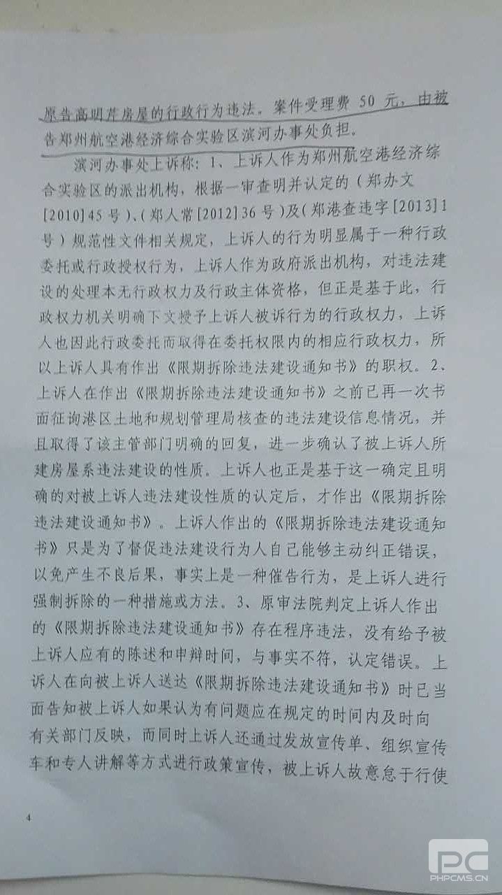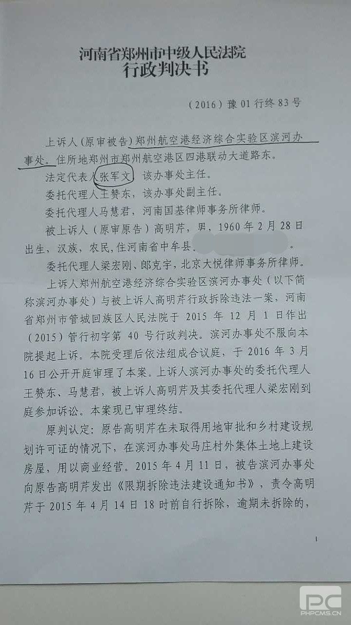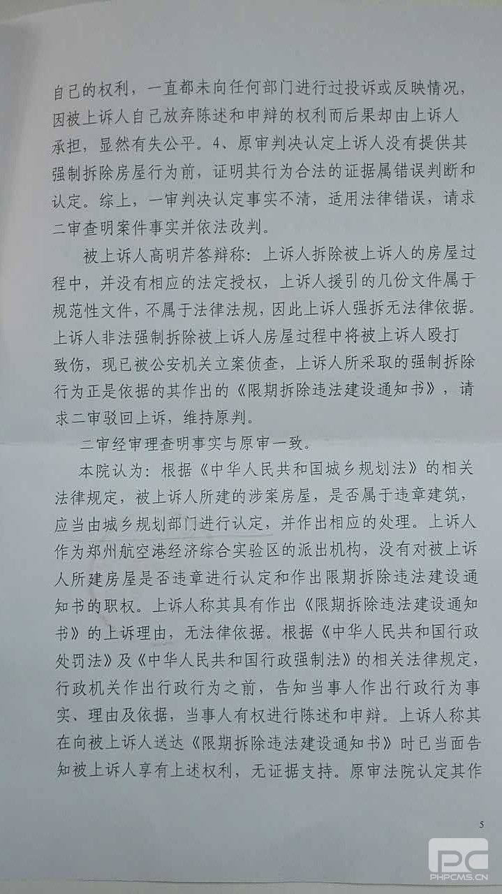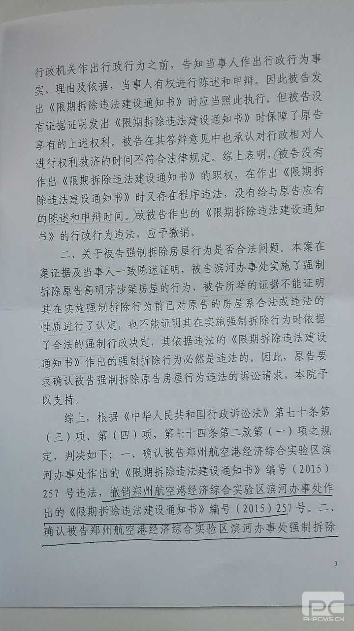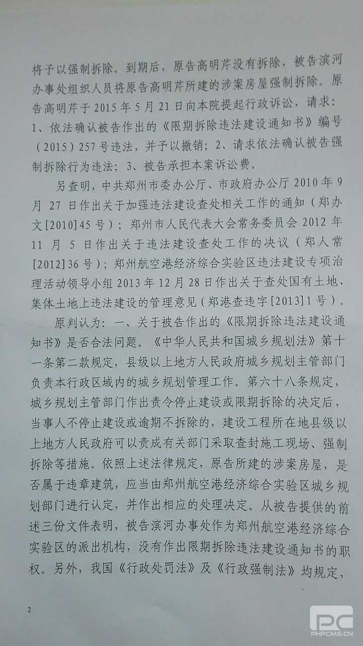 2016年3月17日,由我所郎克宇律师、梁宏刚律师代理的河南省郑州市中牟县张庄镇村民高明芹的行政拆除违法一案,经二审终审,被郑州市中级人民法院判决维持原判,依法认定滨河办事处强制拆除的行政行为违法:一、确认被告郑州航空港经济综合实验区滨河办事处作出的《限期拆除违法建设通知书》编号(2015)257号违法,撤销郑州航空港经济综合实验区滨河办事处作出的《限期拆除违法建设通知书》编号(2015)257号。二、确认被告郑州航空港经济综合实验区滨河办事处强制拆除高明芹房屋的行政行为违法。